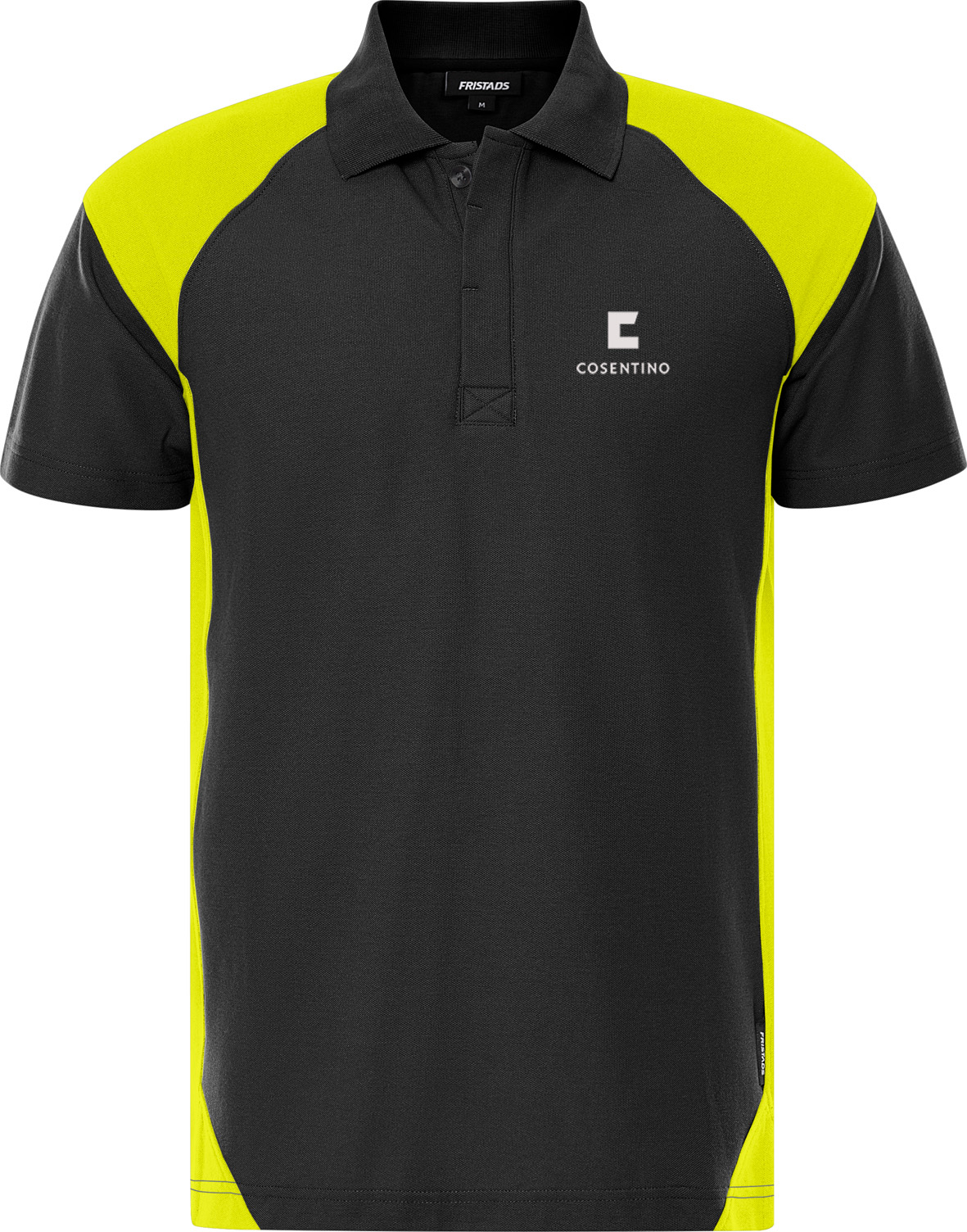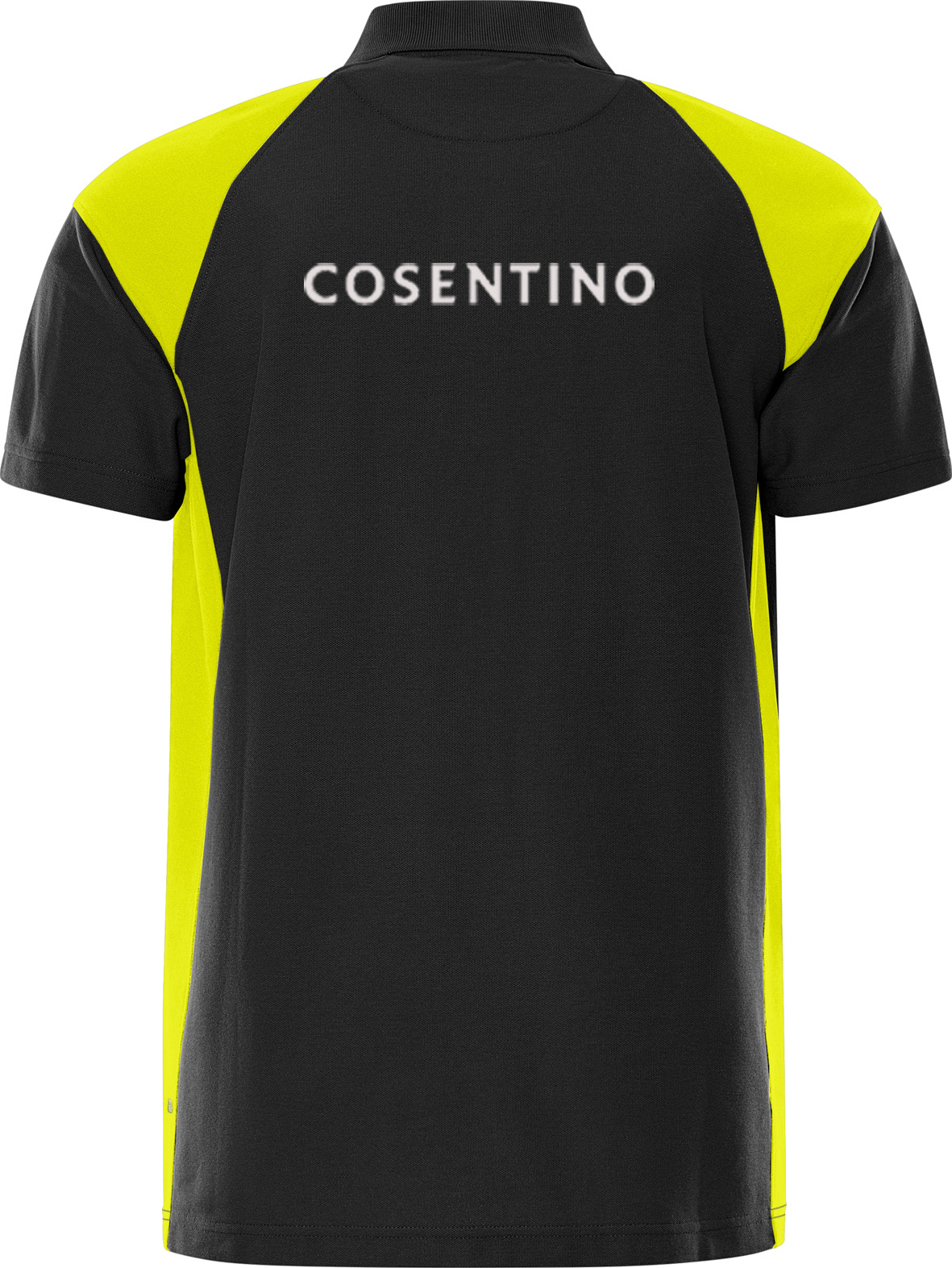 Deze zwarte polo met felgele inzetstukken op de schouders en zijdes wordt geleverd met het borst- en ruglogo van Cosentino.