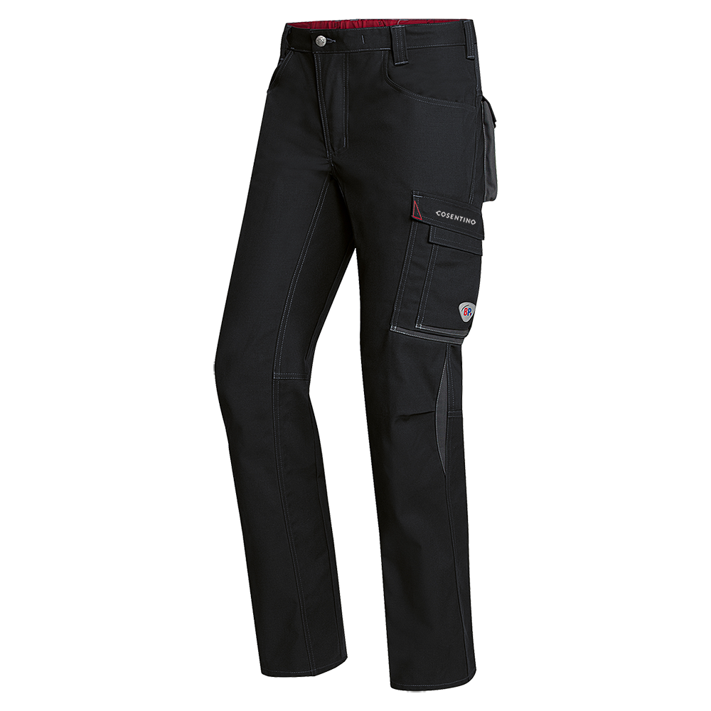 De zwarte werkbroek (met grijze accenten) wordt geleverd met het Cosentino logo op de klep van de zak.