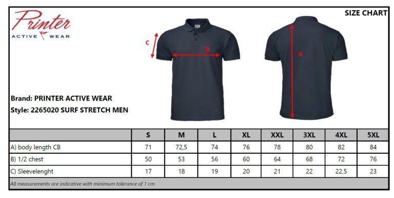 2265020 poloshirt SURF STRETCH van Printer Active Wear is gemaakt van 95% katoen – 5% elastaan – 200 g/m².