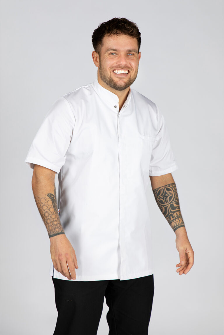 Een van de opvallende kenmerken van de Cheffix koksbuis Vin kortemouw is het eigentijdse en functionele ontwerp. De buis heeft een pasvorm die een professionele uitstraling geeft zonder in te boeten aan bewegingsvrijheid. De korte mouwen bieden extra comfort en bewegingsvrijheid, vooral tijdens het werken met hete oppervlakken en vloeistoffen. De dubbele rij knopen aan de voorkant zorgt voor een klassieke look, terwijl de verborgen drukknoopsluiting een moderne twist toevoegt. Bovendien zijn de knopen eenvoudig te verwijderen, wat het wassen en strijken van de koksbuis vergemakkelijkt.